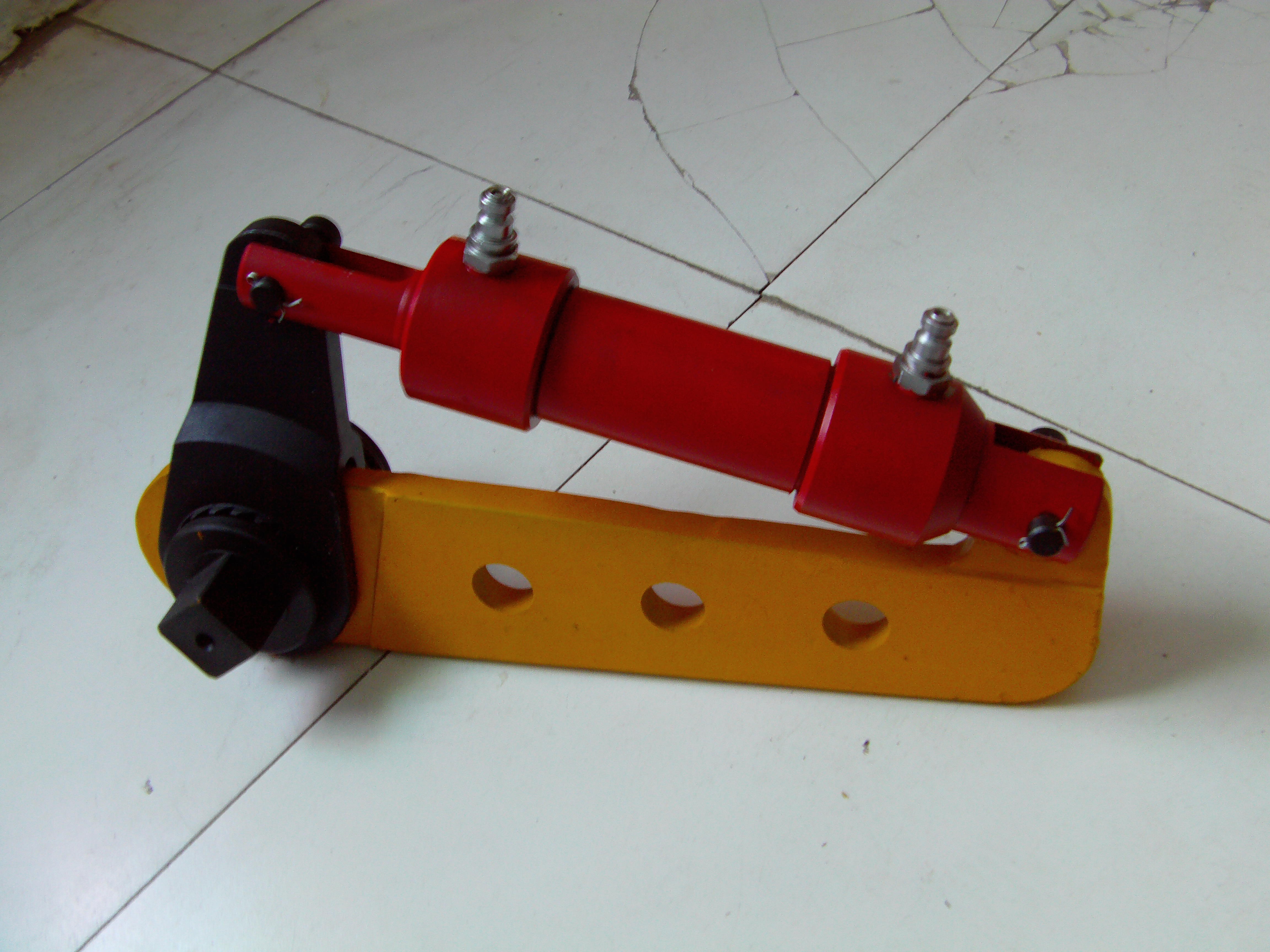 大功率液壓扳手由手動高壓泵和帶棘輪式液壓扭矩扳手兩部分組成。操縱手動高壓泵的手柄,液壓缸產(chǎn)生推力,經(jīng)過曲柄系統(tǒng)形成力矩,帶動螺母轉(zhuǎn)動一個(gè)角度,